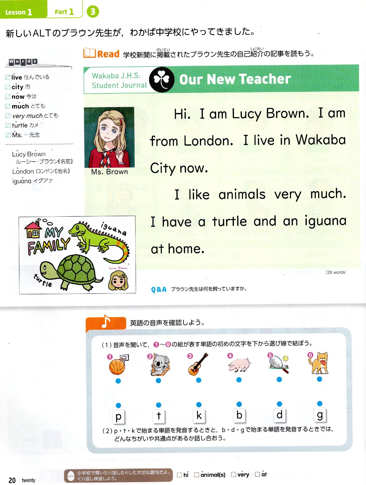 現在の文部科学省の中学1年生の教科書では、UNIT 1から「be動詞」と「一般動詞」が混在して登場します。上の画像では、am, live, like, have がいきなり登場しています。