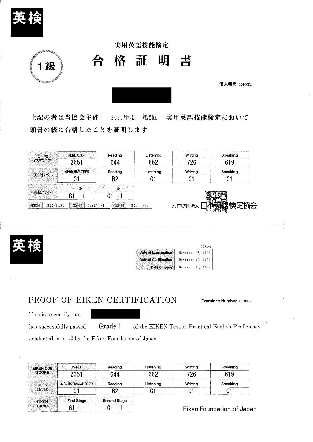 見事!中学生で英検一級合格。