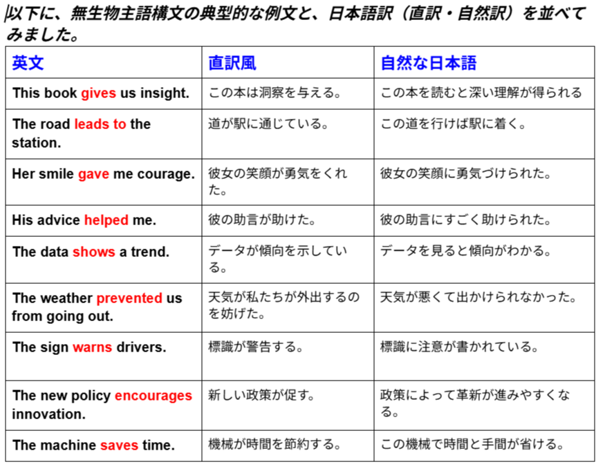 「無生物主語構文」とは、人や動物以外(=無生物)が主語になり、文の中で何らかの“働き”をする文型のことです。たとえば: