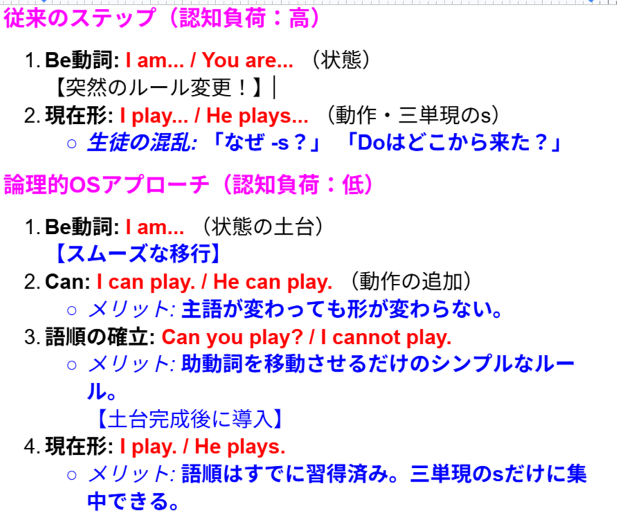 私は長年英語を教えてきましたが、多くの生徒が「現在形」でつまずくのを目の当たりにしてきました。これは彼らにとって最初の大きな壁となります。動詞を教えた直後に現在形を教えるという順序は、論理的ではないと感じています。なぜなら、現在形は「三人称単数」「語順」「be動詞との区別」といった多くの要素を同時に吸収しなければならず、生徒に過度な認知負荷をかけてしまうからです。否定文や疑問文での語順に集中させるために、まず「can + 動詞の原形」を先に導入し、認知負荷を軽減する方が理にかなっているのではないでしょうか。