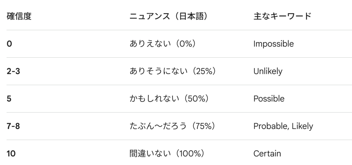 確信度別・推量の表現パーフェクトガイド(0%〜100%)