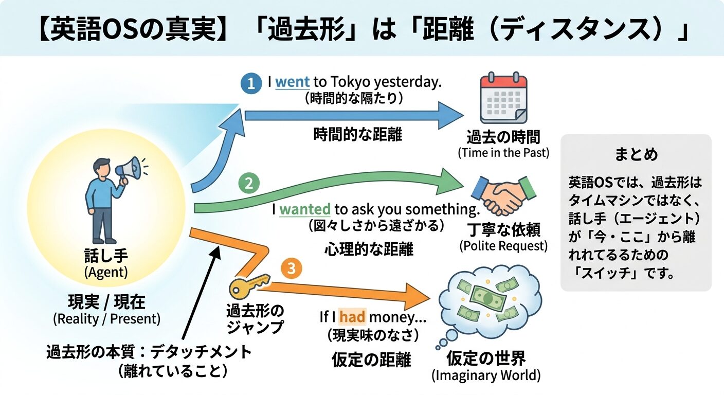 英語OSにとって、過去形は「タイムマシン」である以上に、**「現実からデタッチ(分離)するためのツール」**なのです。